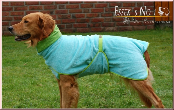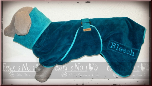 Reiner Bademantel mit extra langem Kragen zum schnellen Trocknen deines Hundes im Haus. So bleibt auch dein Heim sauber und trocken.