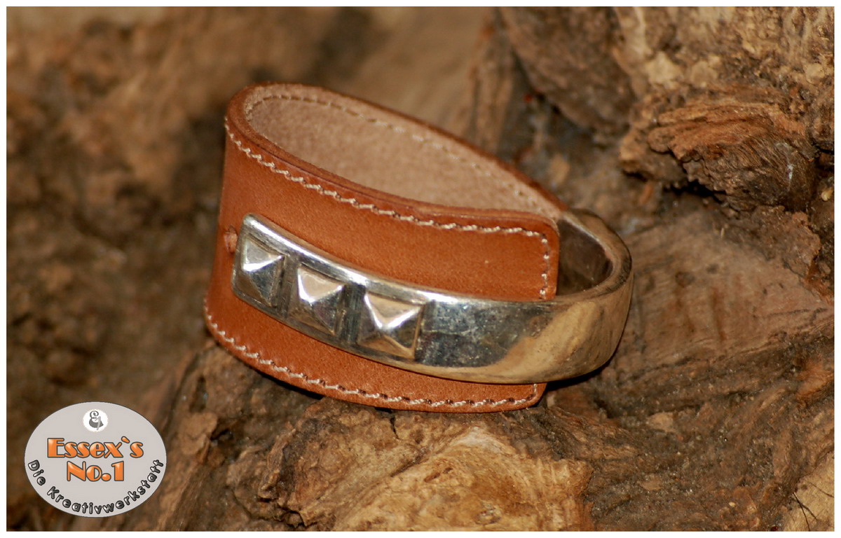 Cooles extravagantes Armband, bestehend aus einer halben Armspange aus Zamak und einem breiten abgenähtem Lederstück in braun, hergestellt in liebevoller Handarbeit.