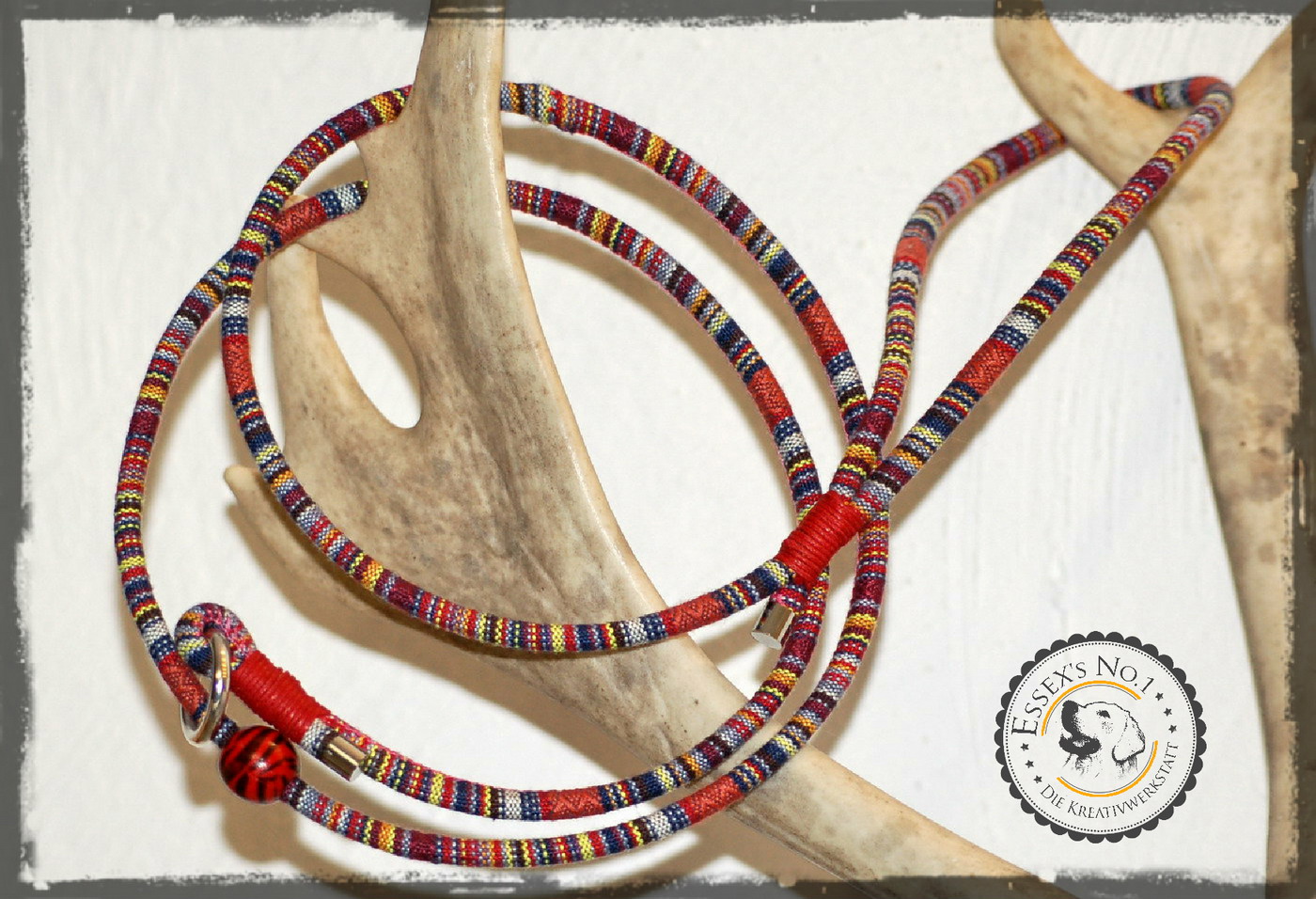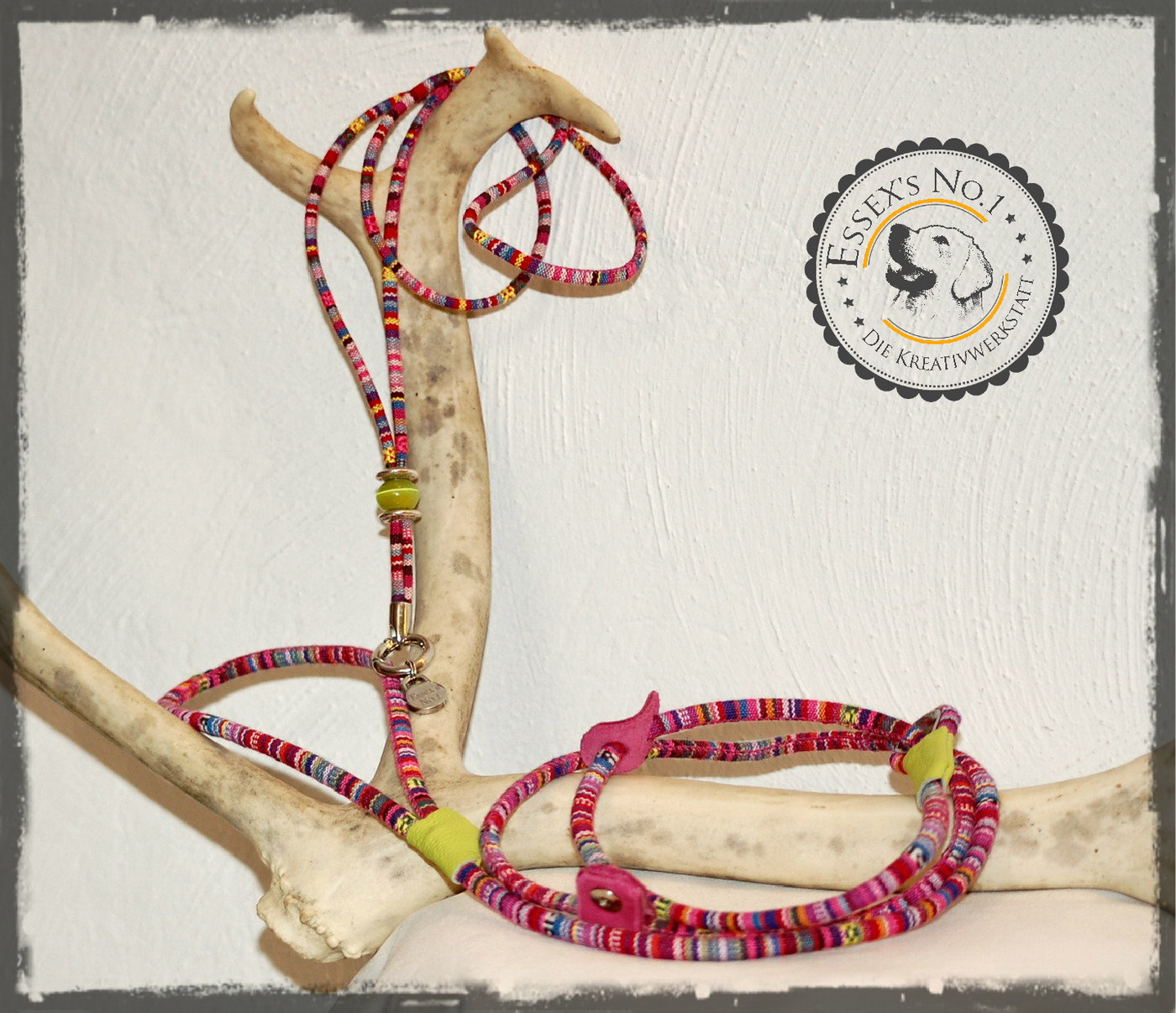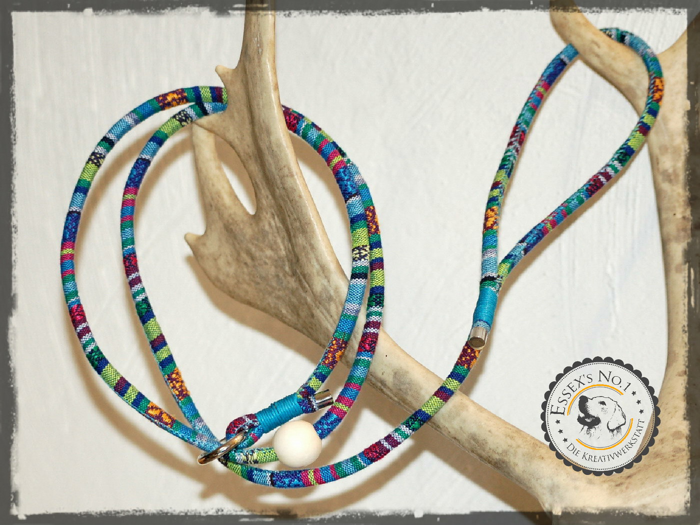 Kunterbunte Retrieverleinen aus handgewebten Ethno-Baumwollbändern mit Kern mit Handschlaufe und Halsung mit Stopp und/oder Zugstopp sowie farbiger Ummantelung, in Handarbeit liebevoll gefertigt.