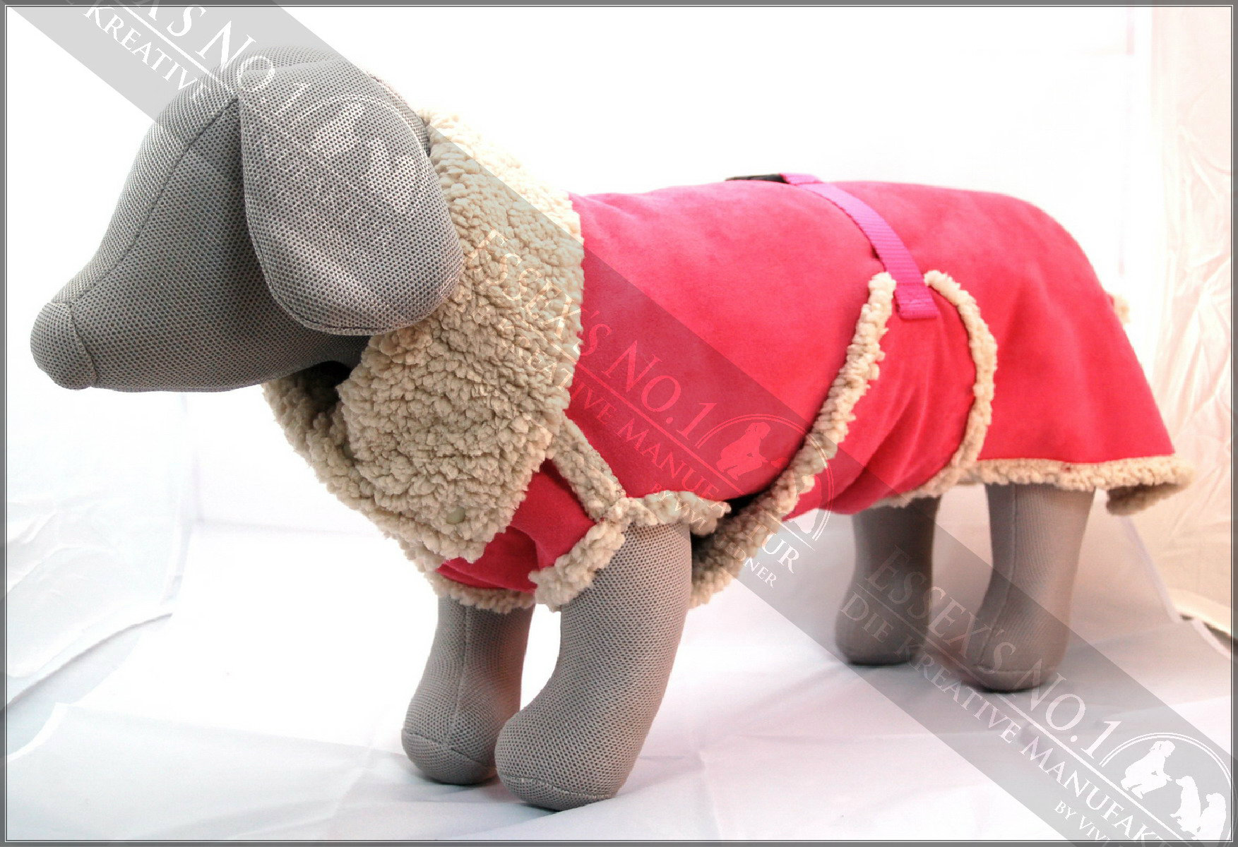 Kuschelweicher Hundemantel aus Wildleder-Lammfellimitat mit langem Kragen, liebevoll in Handarbeit auf Maß angefertigt.