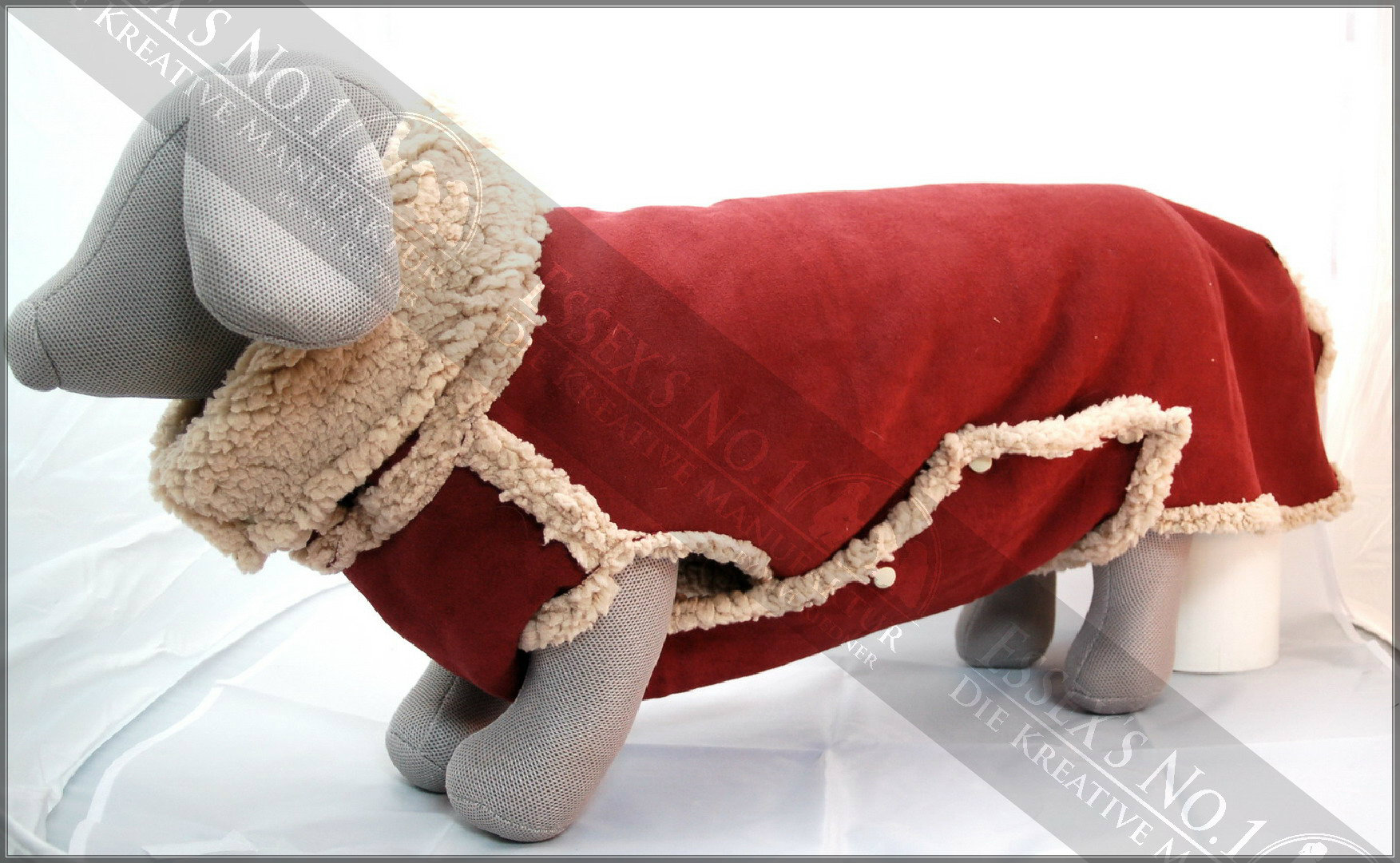 Kuschelweicher Hundemantel aus Wildleder-Lammfellimitat mit langem Kragen und seitlichen Druckknöpfen, liebevoll in Handarbeit auf Maß angefertigt.